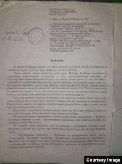 "Командир моей роты Ильдар Дадашев, находясь в состоянии алкогольного опьянения, в лесу, расположенном недалеко от пос. Мулино Нижегородской области, совершил в отношении меня акт жестокого насилия. На полевой кухне части он без всякой причины задал мне вопрос: "Ты мужик или нет?". После моего утвердительного кивка он приказал мне положить руки на стол. Когда я выполнил его приказ, он схватил биту для отбивания мяса и нанес ею множественные удары по моим пальцам, причинив мне острую боль и травмировав их. Затем он схватил черенок от лопаты и его концом силой ткнул мне в лоб, затем в грудь, после чего начал наносить удары этим же черенком по моим ногам. В результате одного из ударов я почувствовал резкую боль и хруст в ноге, после чего не смог на нее наступать", – говорится в показаниях Гафарова в обращении в военную прокуратуру Уфы.