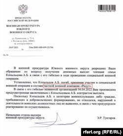 А вот высказывание Путина о том, что у министерства обороны отсутствуют списки воюющих, уже не соответствует действительности. В распоряжении журналистов "Системы" есть ответ прокуратуры Южного военного округа на запрос вдовы бойца "Редута", из которого следует, что государственные органы России не только осведомлены о существовании "частных военных компаний", но и имеют доступ к данным об их служащих и выплатах им. Ответ вдове пришел в июле 2023 года.