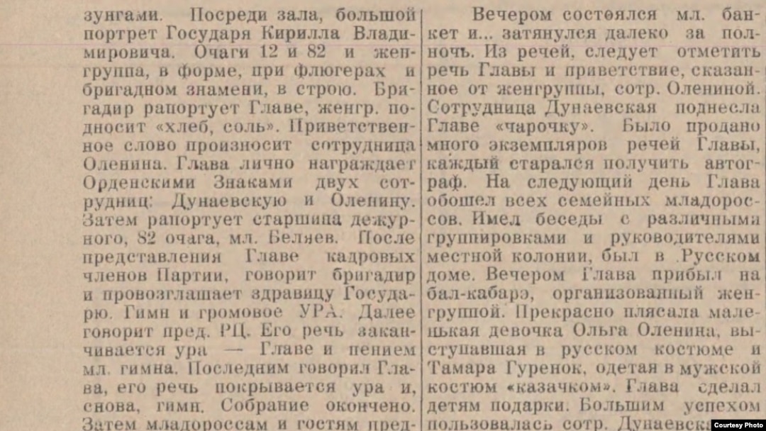 «Красивый зал был украшен младоросскими значками и лозунгами. Посреди зала большой портрет Государя Кирилла Владимировича. Очаги 12 и 82 и женгруппа в форме при флюгерах и бригадном знамени в строю. Бригадир рапортует Главе, женгруппа преподносит хлебсоль…. После представления главе кадровых членов партии говорит бригадир и провозглашает здравице Государю. [Следуюшая] речь заканчивается ура — Главе и пением младоросского гимна».
